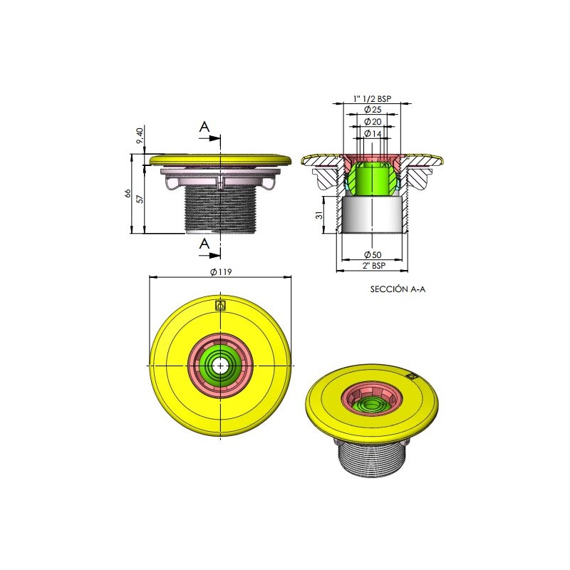 MULTIFLOW SYSTEM Este sistema consiste en que la bola de la boquilla se suministra premarcada con una serie de diámetros (14-20 y 25). Con la ayuda de un punzón (también suministrado junto a la boquilla) se puede seleccionar uno de los diámetros en el momento de la instalación. Caudal máx. recomendado para una velocidad de paso máx de 4 m/seg., según norma UNE 13451-1: