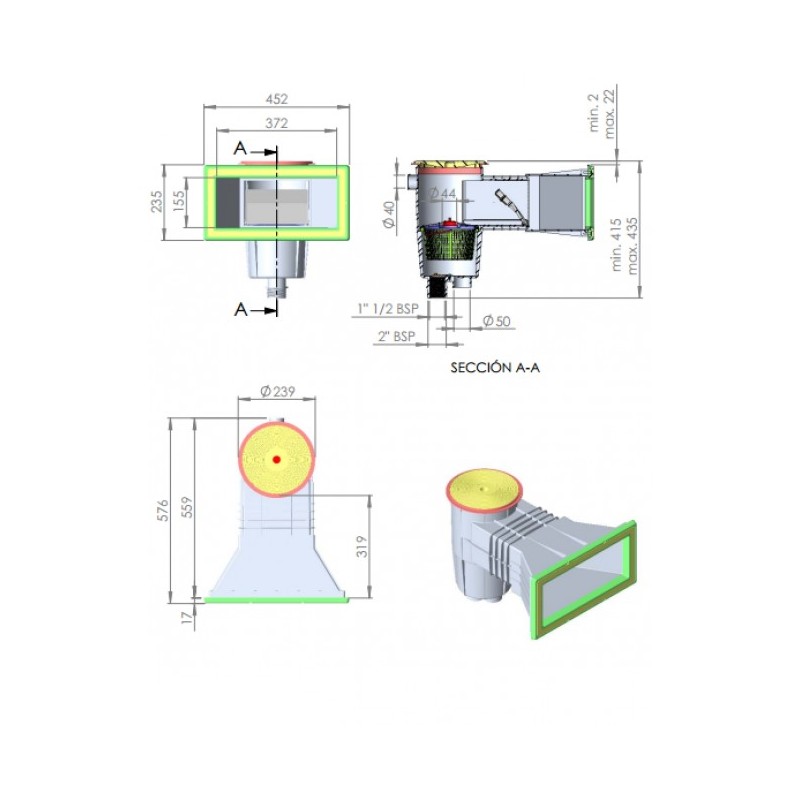 Skimmer boca ampliación con tratamiento UV en las partes que no quedan enterradas. Fabricados en ABS blanco, con flotador de compuerta y clapeta para regulación de caudal. Conexión inferior de aspiración: rosca int. 1 1/2", ext, 2". Conexión simultánea al sumidero:Ø int. 50. Conexión superior de evacuación de agua sobrante Ø 40. Cesto recogehojas. Caudal recomendado 5 m3/h. Se recomienda instalar un skimmer por cada 25 m2 de superficie de lámina de agua.